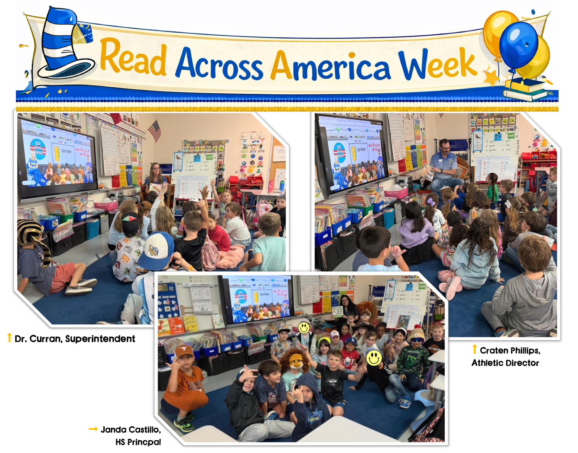 During Read Across America Week, the Superintendent, High School Principal, and Athletic Director visited elementary classrooms to read with students and celebrate the power of a good book.