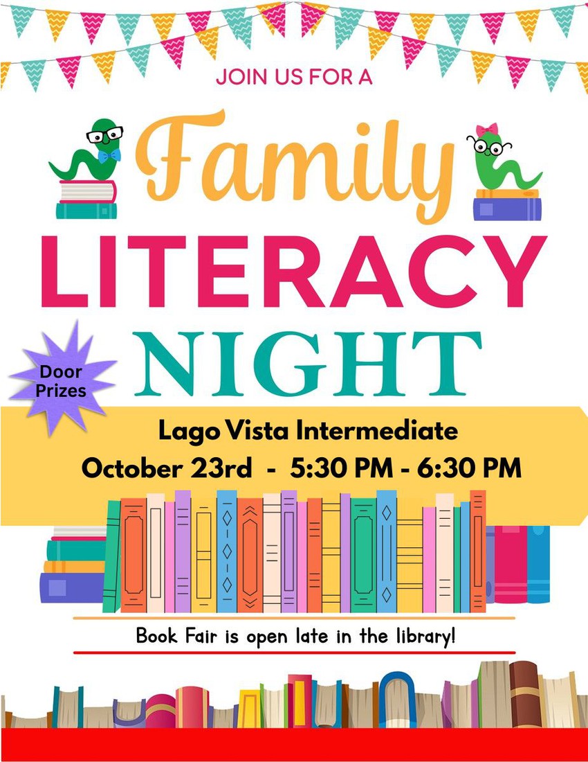 Mark Your Calendar for Family Literacy Night Family Literacy Night is scheduled for Thursday, October 23rd from 5:30-6:30pm. We will have spooky stories, crafts, door prizes, and more.